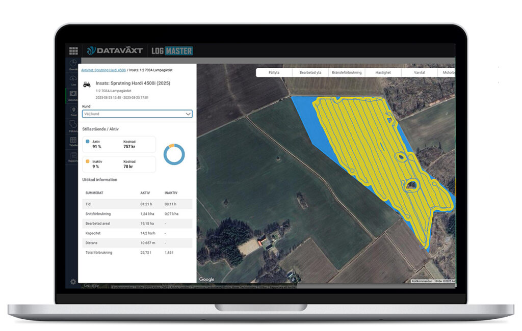 Tagga specifik insats med kund, ta ut kundrapport från årets/säsongens körningar. Med LogMASTER får du reda på hur mycket tid som har gått åt. Med hjälp av de olika temakartorna ser du lätt variationerna på vart och ett av dina fält.