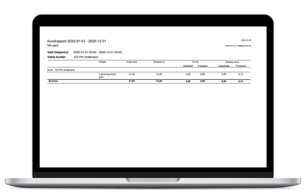 Få en summering från LogMASTER för dina arbeten under växtodlingsåret – skifte för skifte. Tid och bränsleförbrukning sammanställs för dig.